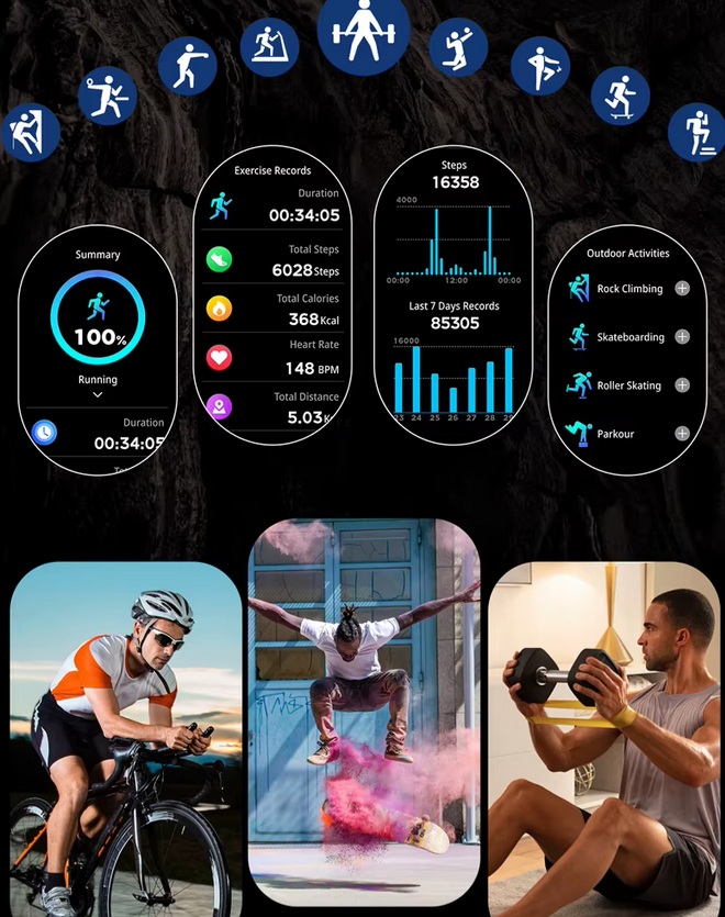 Tryby sportowe – dokładne śledzenie kroków, dystansu i spalonych kalorii w wielu trybach treningowych.