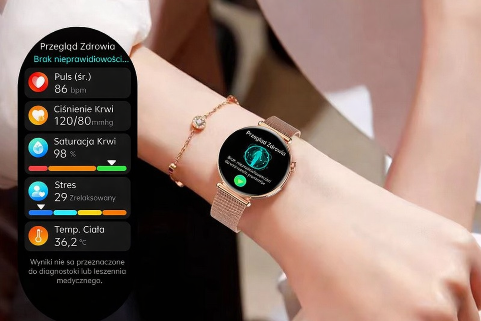 Zegarek umożliwia m.in. pomiar EKG, HRV, tętna, temperatury oraz orientacyjną analizę organizmu.